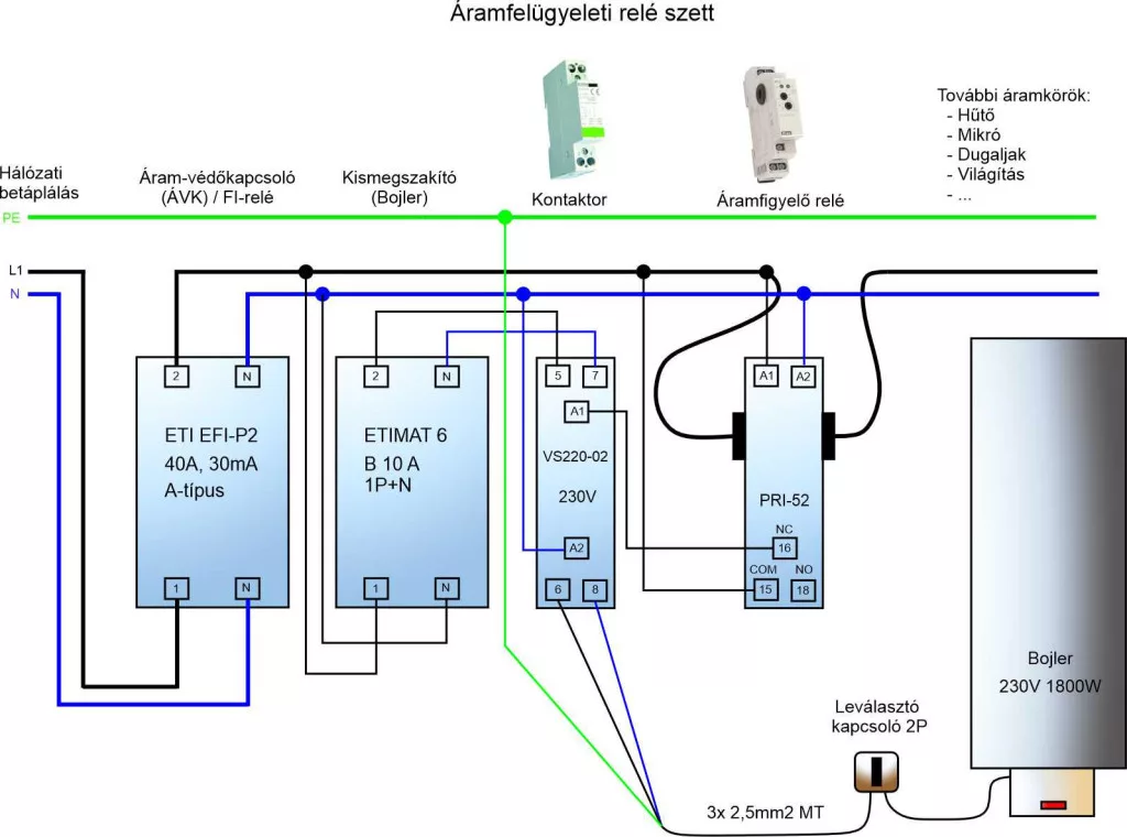 A szett tartalmaz egy áramfelügyeleti relét és egy kontaktort, amelyek együttműködve figyelik a hálózat terhelését. Ha túl sok készülék működik egyszerre, a relé a kontaktor segítségével automatikusan lekapcsolja a kevésbé fontos berendezést (például a bojlert), így az alapvetően szükséges fogyasztók – hűtő, világítás, klíma – zavartalanul működhetnek.